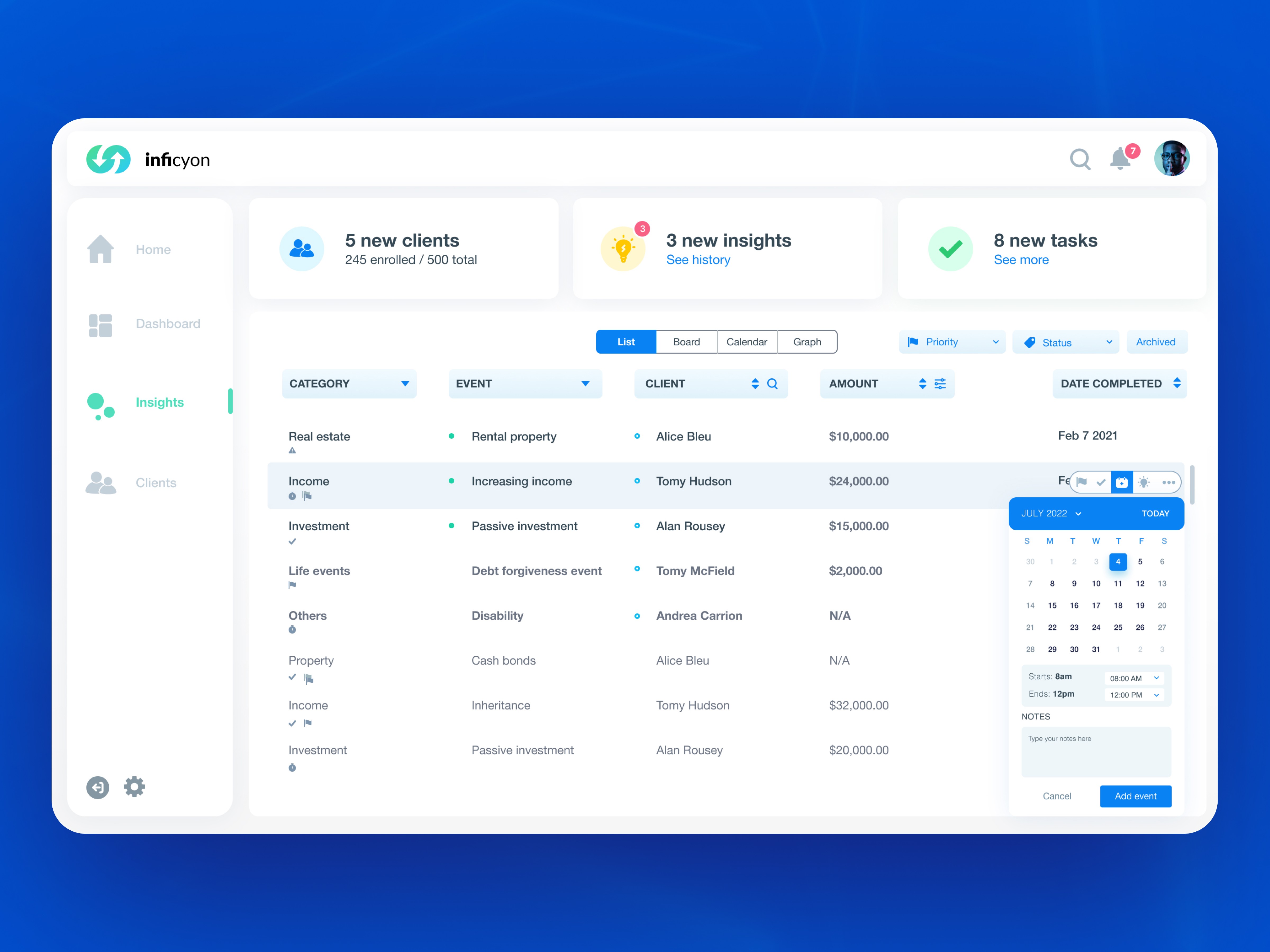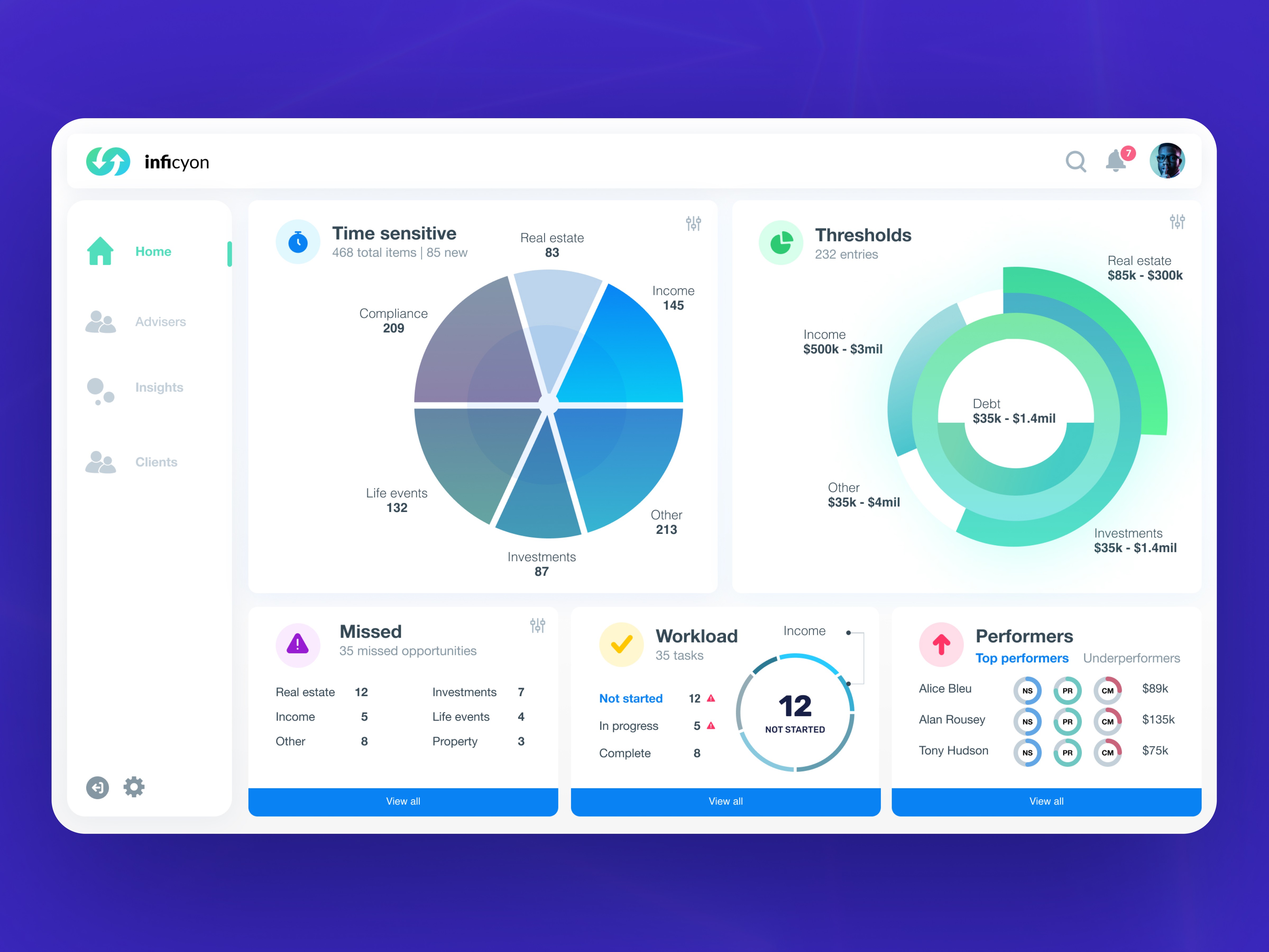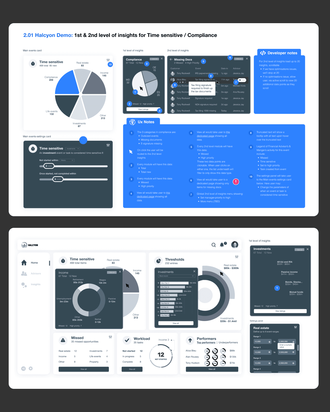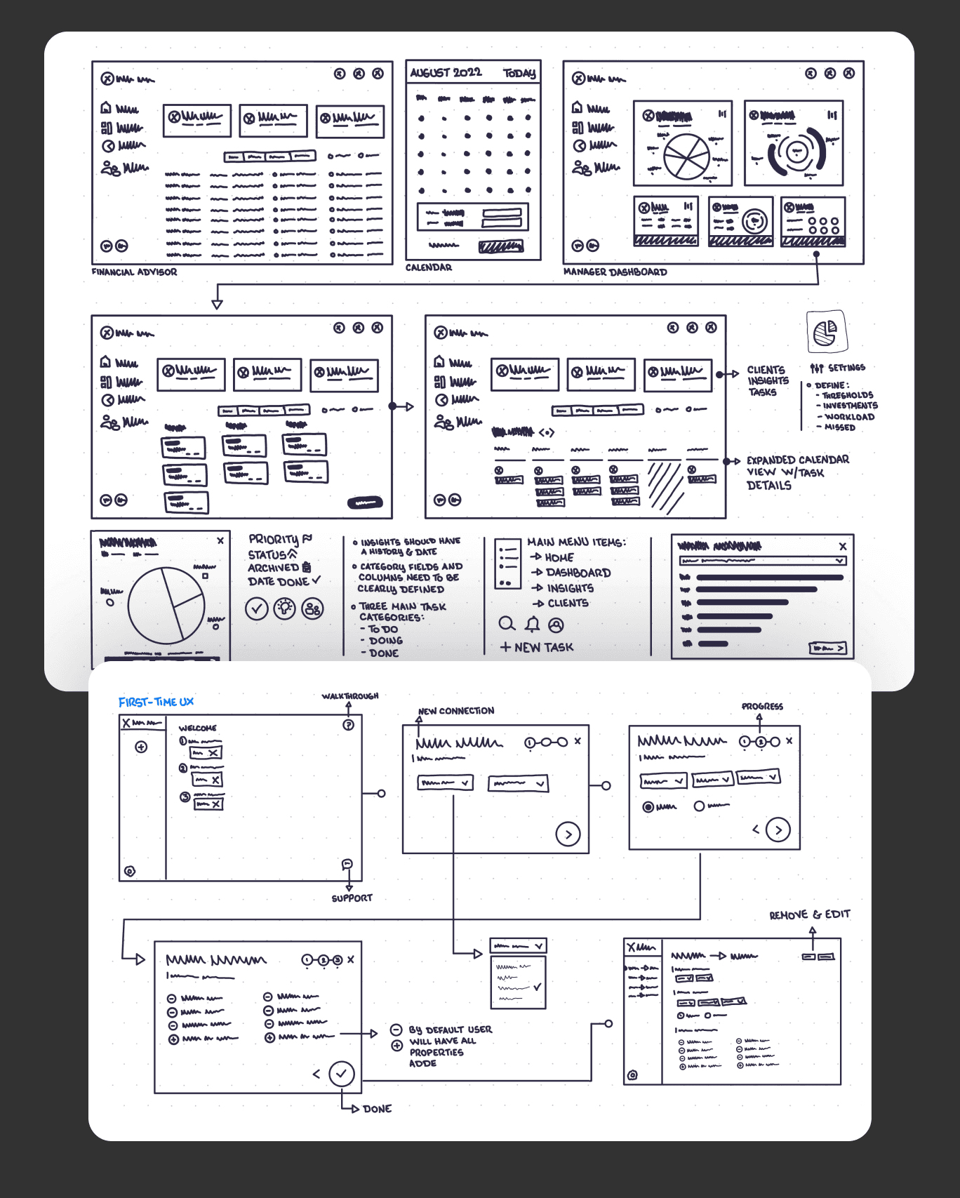 The process moved from research insights into archetypes, wireframes, and prototypes, before evolving into polished dashboards and a scalable design system.